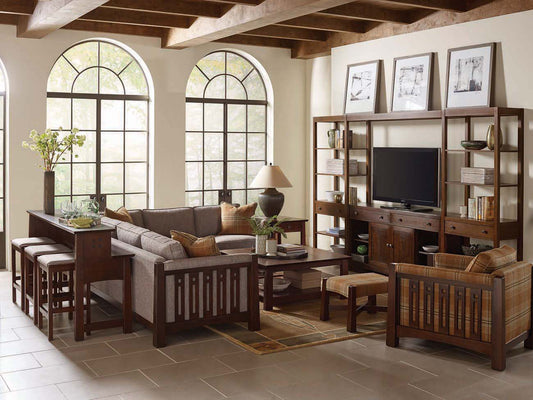 Some furniture takes up space: Stickley’s patented Gathering Islands create it. They’re designed to fit like a glove behind a variety of sofas, offering additional seating as well as functional shelves and workspace. A gathering island lends itself beautifully to both roomy open-plan living styles and space-challenged apartments.