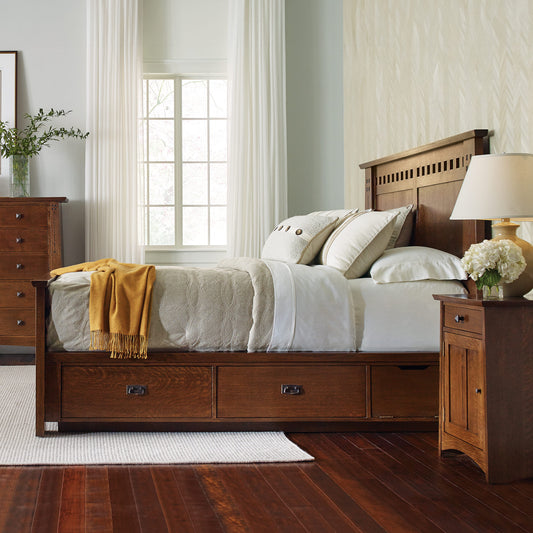 Cases feature Mission-style pyramidal knobs (dark copper on oak and light copper on cherry), as well as drop pulls on the Highlands bed with platform storage.